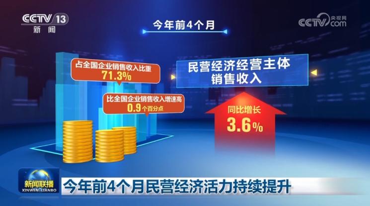 升值税发票数据流露,本年前4个月,民营经济方针主体销售收入同比增长3.6%,比宇宙企业销售收入增速高0.9个百分点,占宇宙企业销售收入比重71.3%。分行业看,制造业、高本领产业民营企业销售收入增长较快,增速均高于宇宙同业业平均水平。